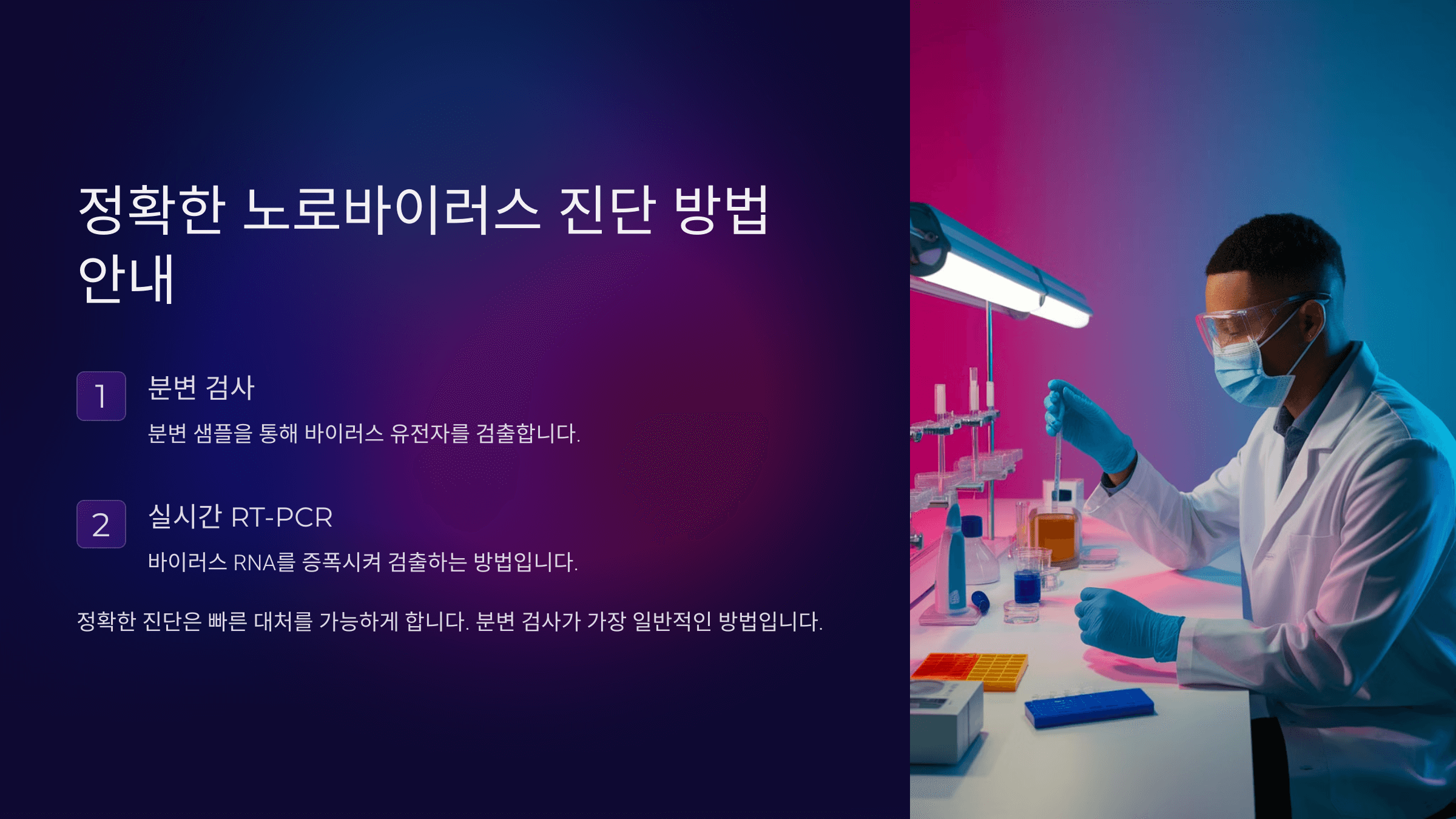 주로 PCR 검사나 항원 검사를 통해 노로바이러스 감염 여부를 진단해요.