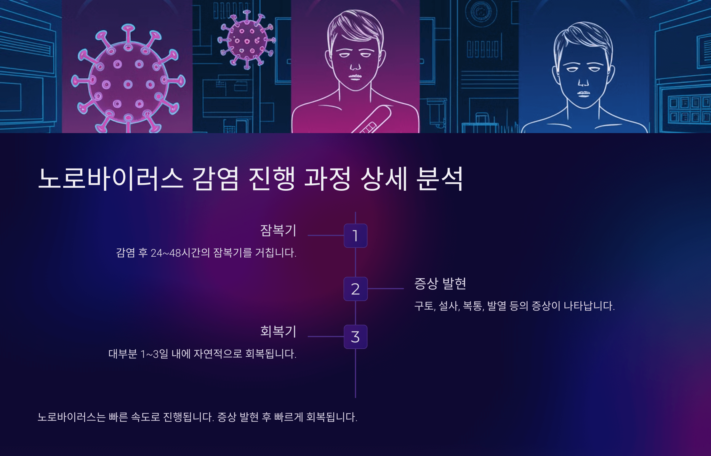 ✔ 노로바이러스는 구토, 설사, 복통 등의 증상을 유발하는 감염병이에요.