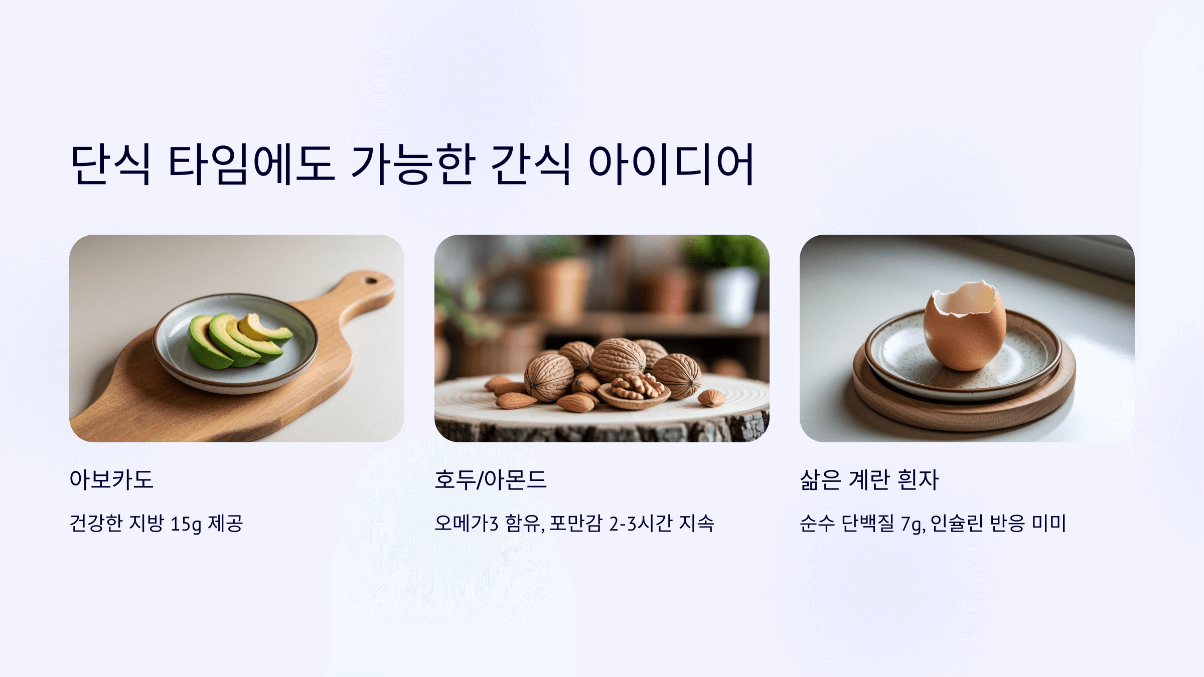 단식 시간에 간식을 먹더라도 전체적인 대사 상태가 유지되도록 선택하는 게 포인트예요. 살짝의 센스만 있으면 단식은 훨씬 더 쉬워진답니다. ✨