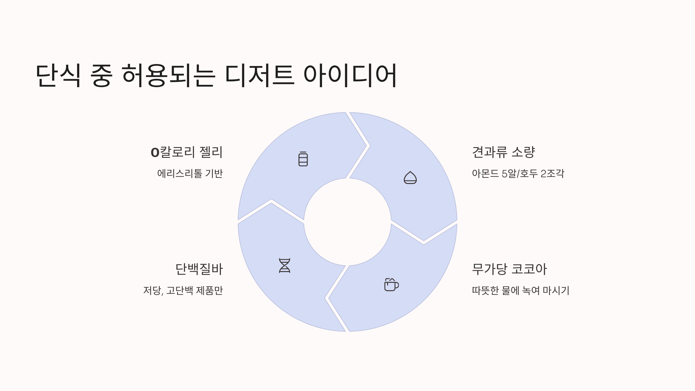 단식 중에도 가끔은 달콤한 게 땡길 때가 있어요. 하지만 무턱대고 디저트를 먹으면 단식 효과를 망칠 수 있어요. 그래서 준비했어요! 단식 중에도 가볍게 즐길 수 있는 건강한 디저트 아이디어를 소개할게요. 😊