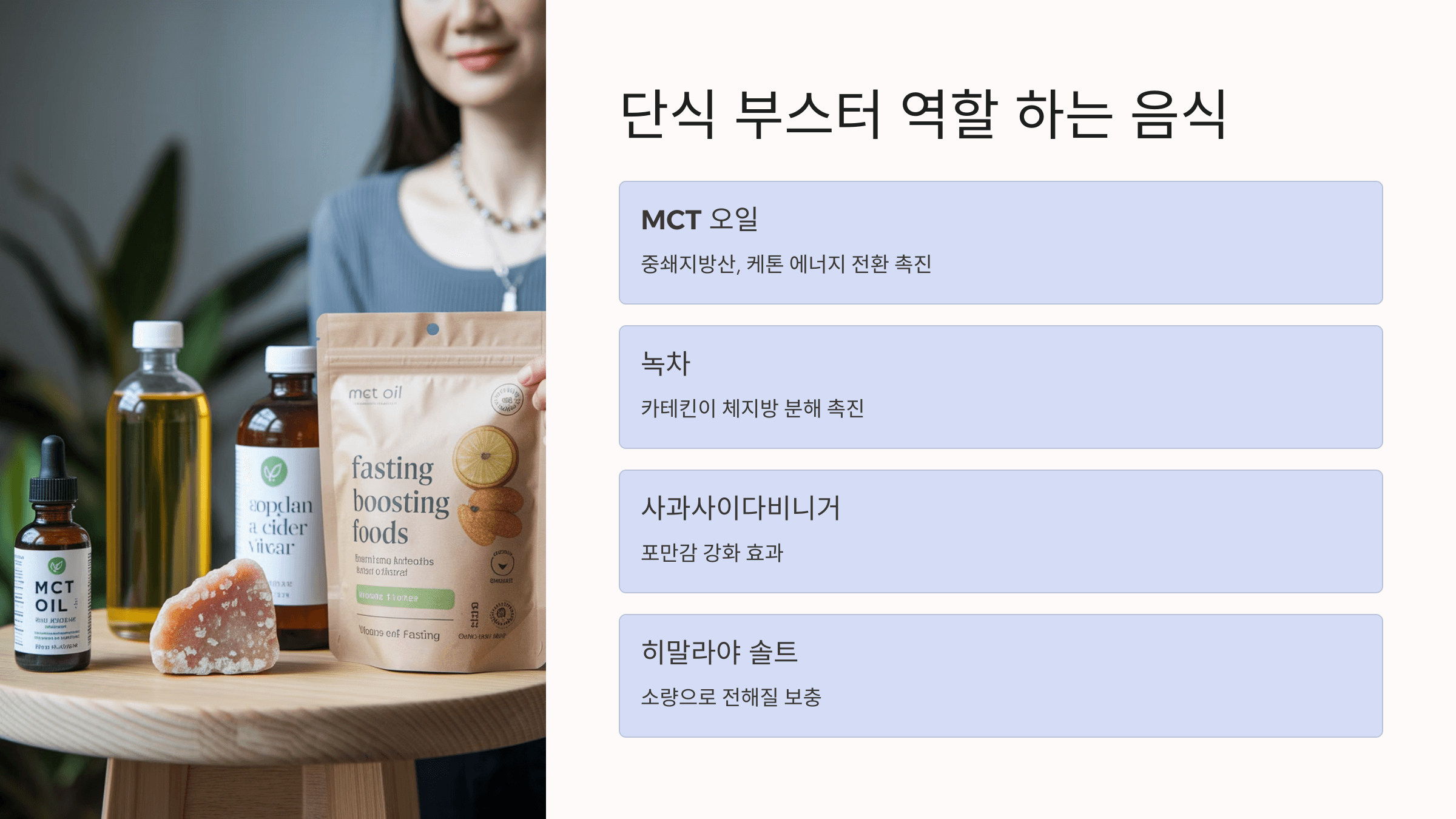 대표적인 단식 부스터는 'MCT 오일'이에요. 코코넛에서 추출한 중쇄지방산인데, 빠르게 에너지원으로 변환돼서 공복감을 싹 날려줘요. 블랙커피에 한두 스푼 넣으면 배고픔도 줄고 머리도 맑아진답니다. ☕️