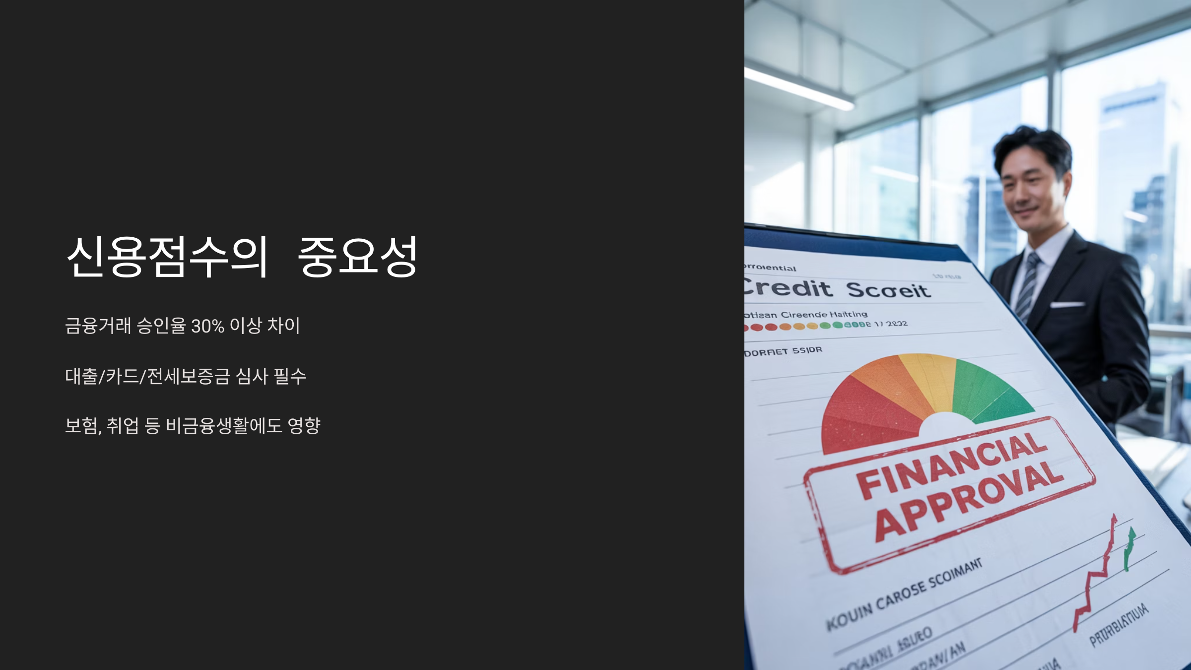 신용점수는 금융생활의 기초 체력이에요. 대출을 받을 때 금리를 결정하는 가장 큰 요소 중 하나이고, 카드 발급, 분할결제, 할부 이용 한도까지 모두 영향을 미쳐요. 높은 점수를 가진 사람일수록 금융사로부터 신뢰를 받기 때문에, 다양한 혜택과 함께 더 나은 조건을 제공받게 되죠.