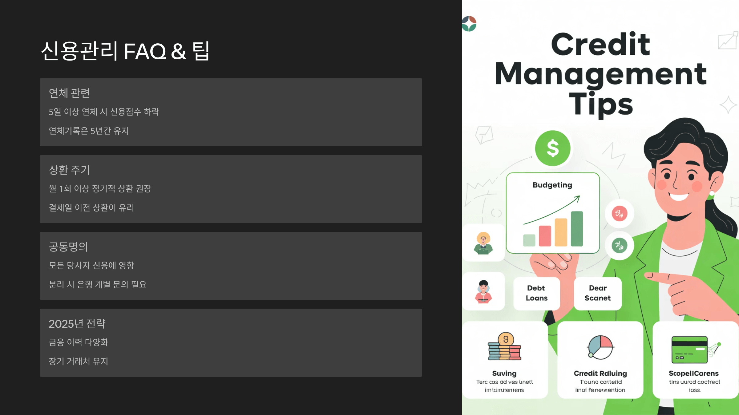중요한 건, 리볼빙 서비스나 고금리 현금서비스를 피하는 거예요. 이런 단기성 대출은 점수에 악영향을 미치기 때문에, 당장 급하다고 써버리면 이후 장기 대출에 불리하게 작용할 수 있어요. 가능한 한 빠르게 정리해야 해요! 🚫