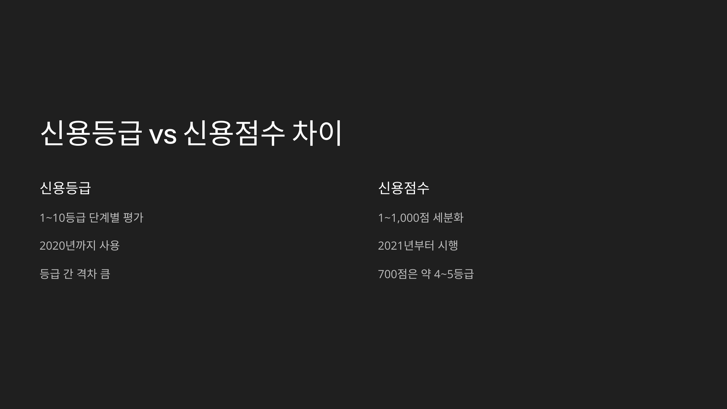 | 항목 | 신용등급 (과거) | 신용점수 (현재) |