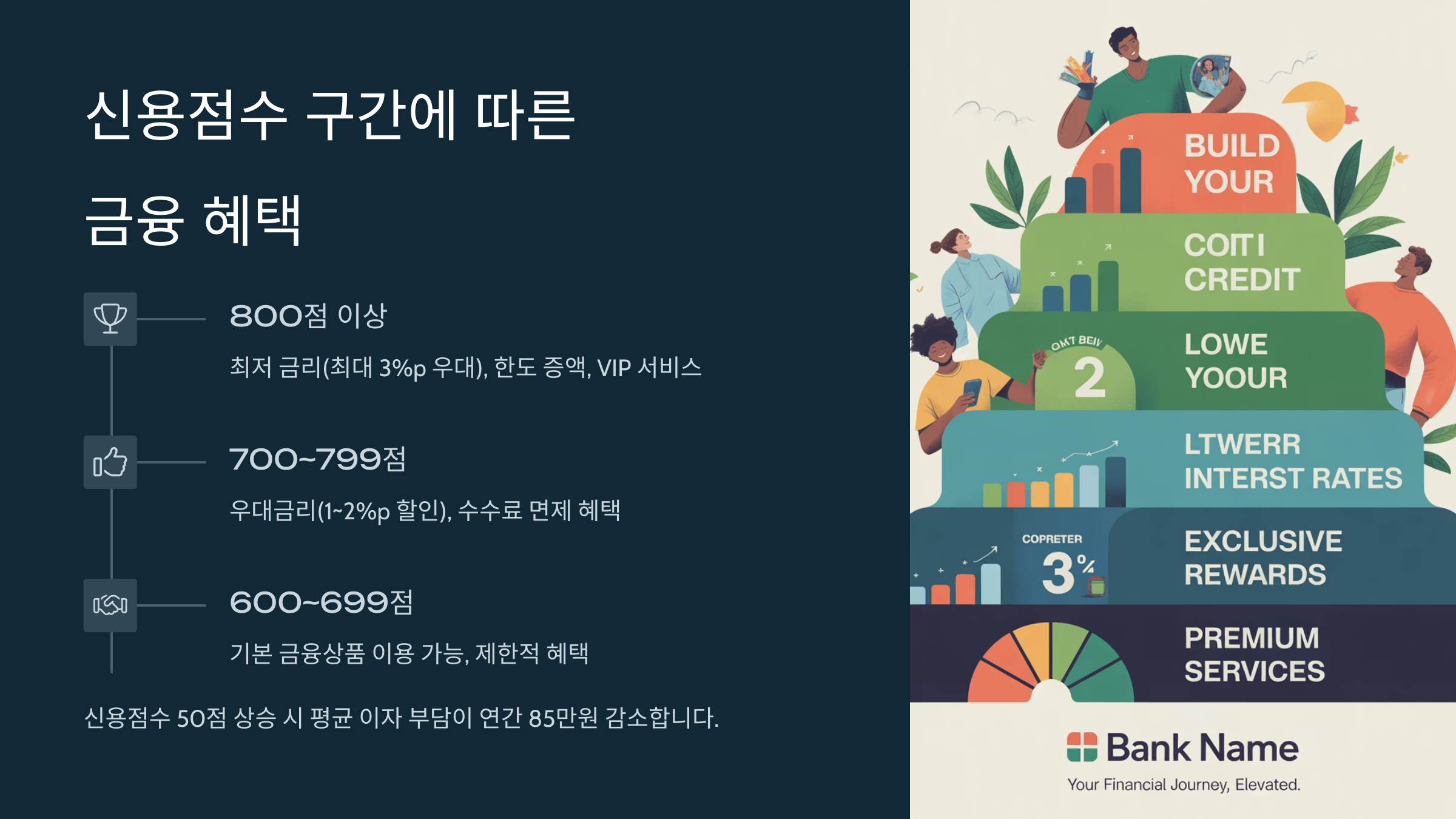 800점 이상은 'VIP 고객'으로 분류되기도 해요. 프리미엄 카드 발급, 대출 우대금리, 고한도 신용거래 등 혜택이 쏟아져요. 같은 금액을 대출해도 이자 차이가 크기 때문에, 신용점수 높은 사람은 실제로 수백만 원을 절약하는 셈이랍니다!