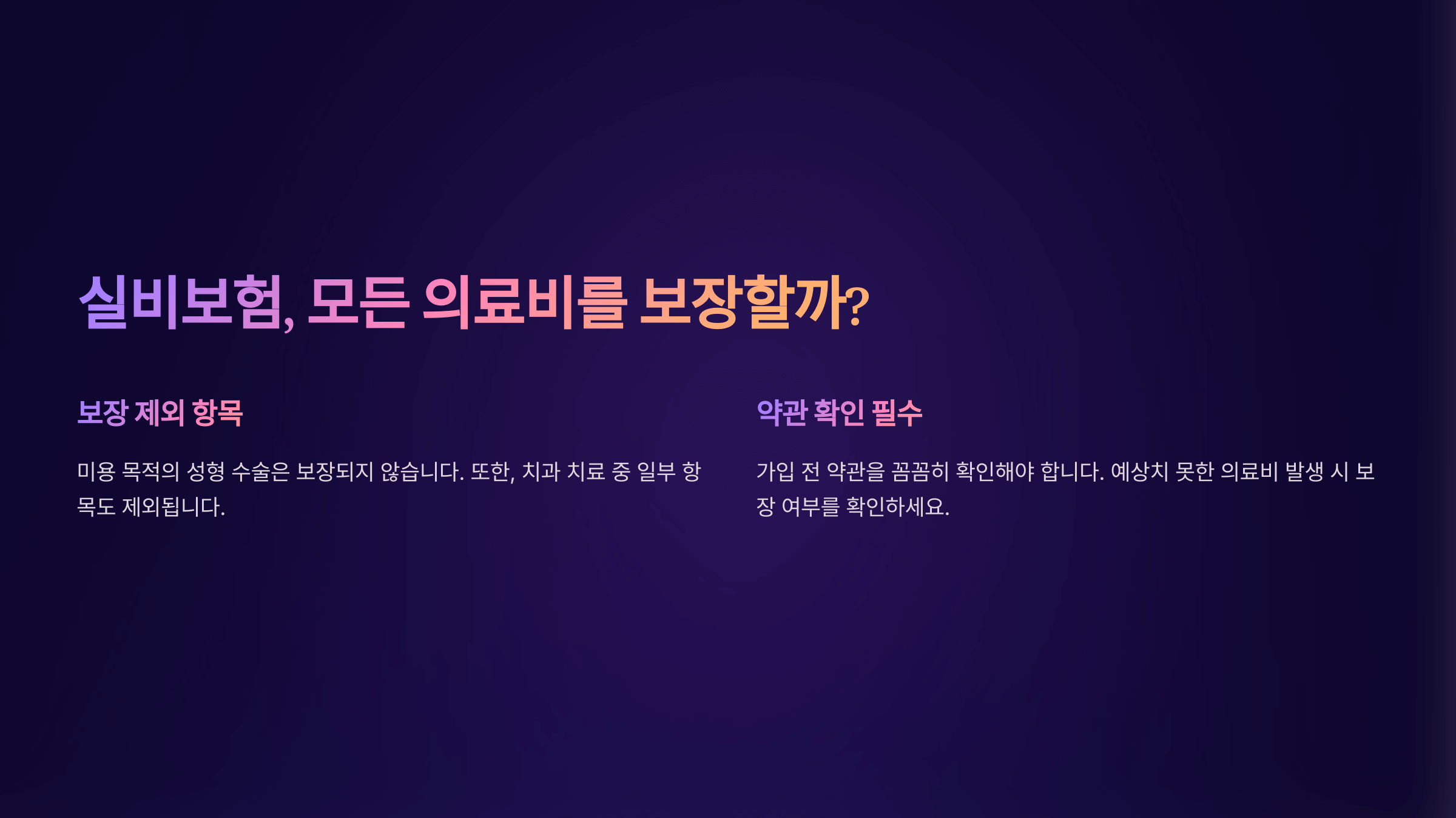 실비보험은 의료비 부담을 덜어주는 중요한 보험이지만, 약관 속 숨겨진 함정이나 보장 제한 사항을 잘 모르면 예상치 못한 불이익을 당할 수도 있어요. 😥