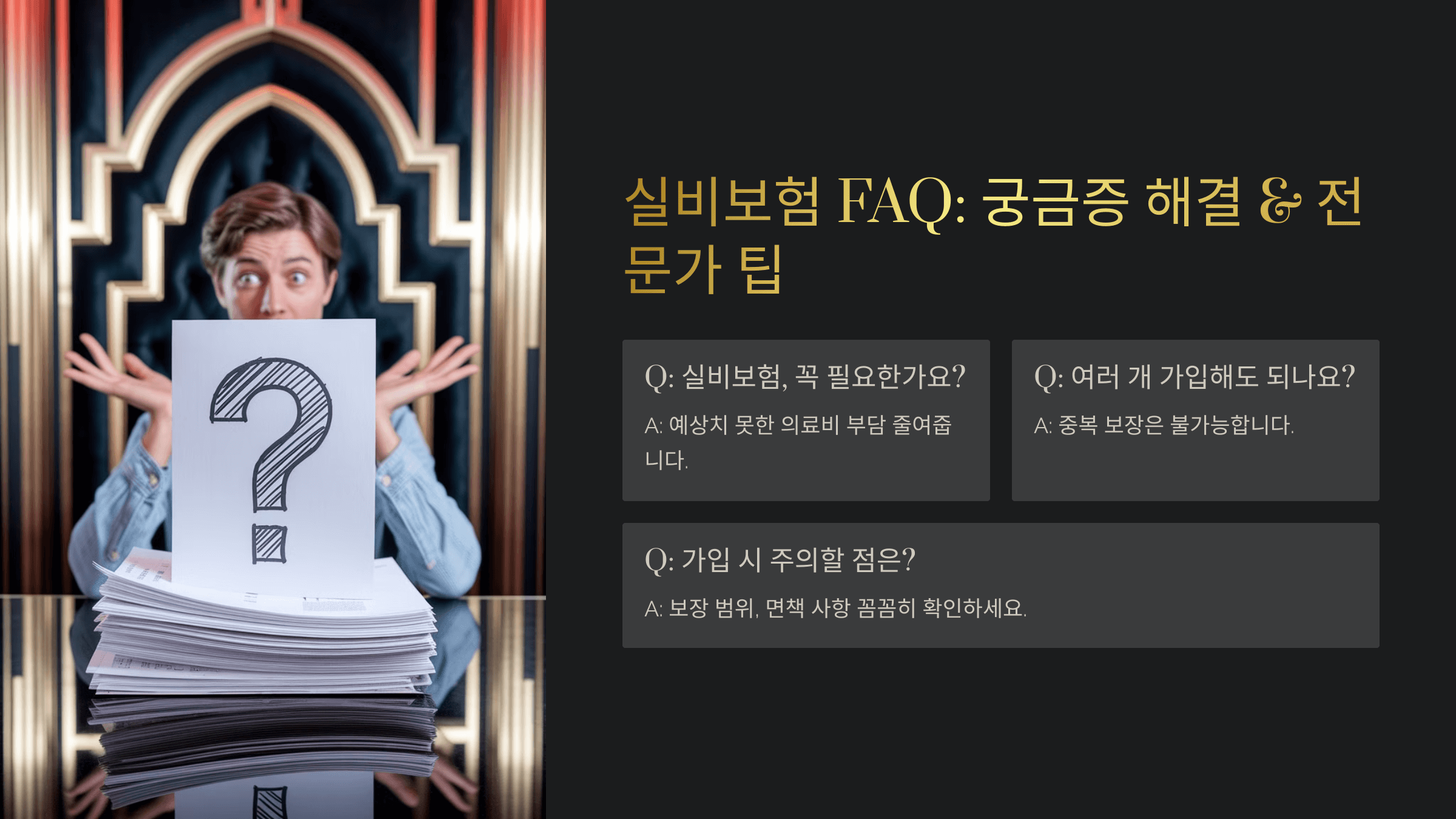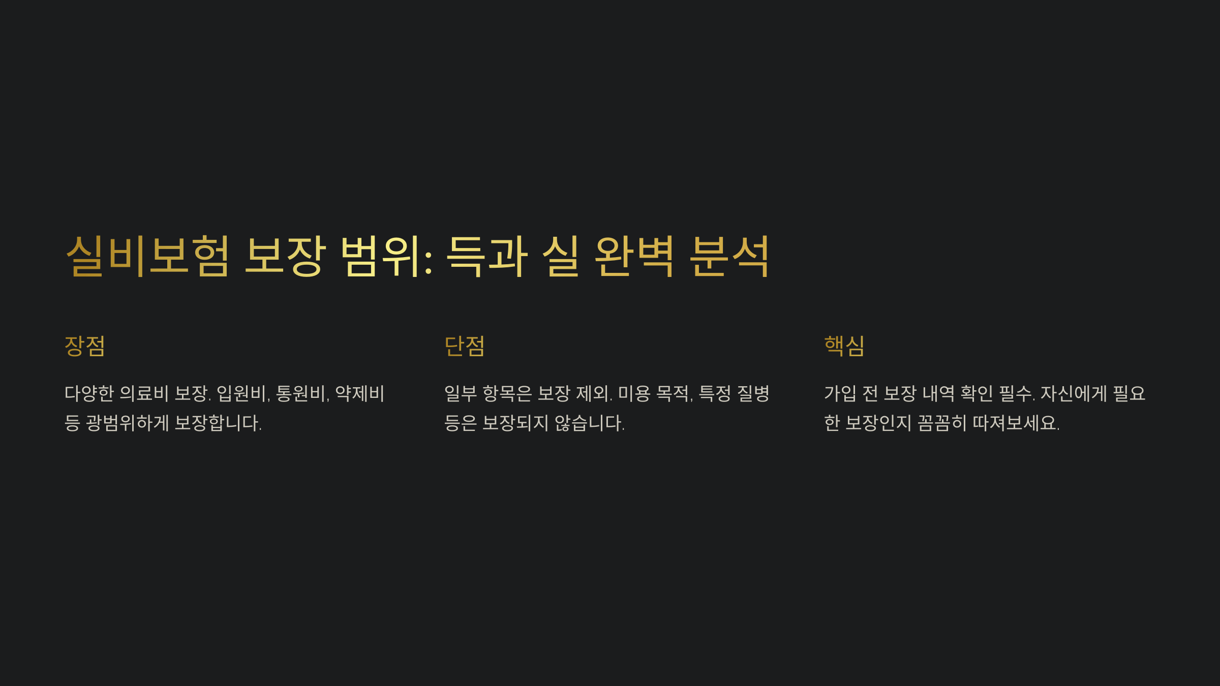 ✅ 보장 범위 확인: 실비보험 상품마다 보장 범위가 조금씩 다를 수 있어요. 특히 비급여 치료 항목의 보장 여부나 본인 부담금 조건을 꼼꼼히 비교해 보세요.