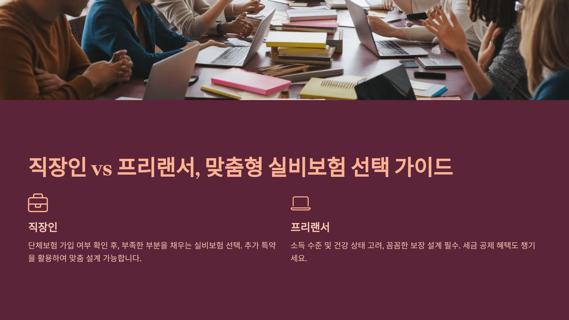 이처럼 실비보험이 없으면 의료비 부담이 커지고, 결국 치료를 미루거나 경제적으로 어려움을 겪을 가능성이 높아져요. 그렇다면 직장인과 프리랜서는 어떤 실비보험을 선택하는 게 좋을까요? 🤔