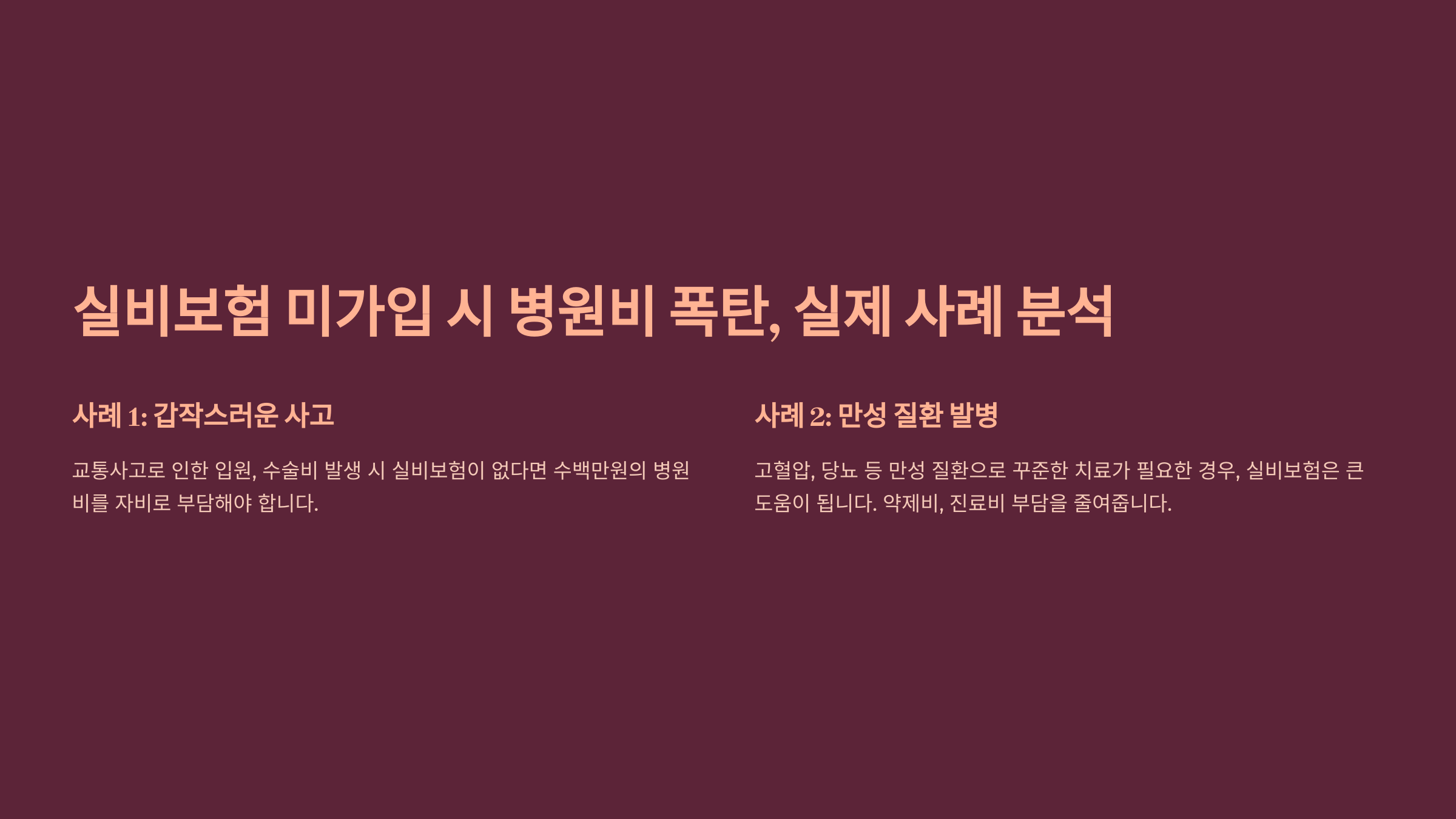 갑자기 큰 병에 걸리거나 사고로 입원해야 한다면 병원비가 수백만 원에서 수천만 원까지 나올 수도 있어요. 실비보험이 있으면 본인 부담금을 줄일 수 있지만, 없으면 모든 비용을 본인이 감당해야 해요.
