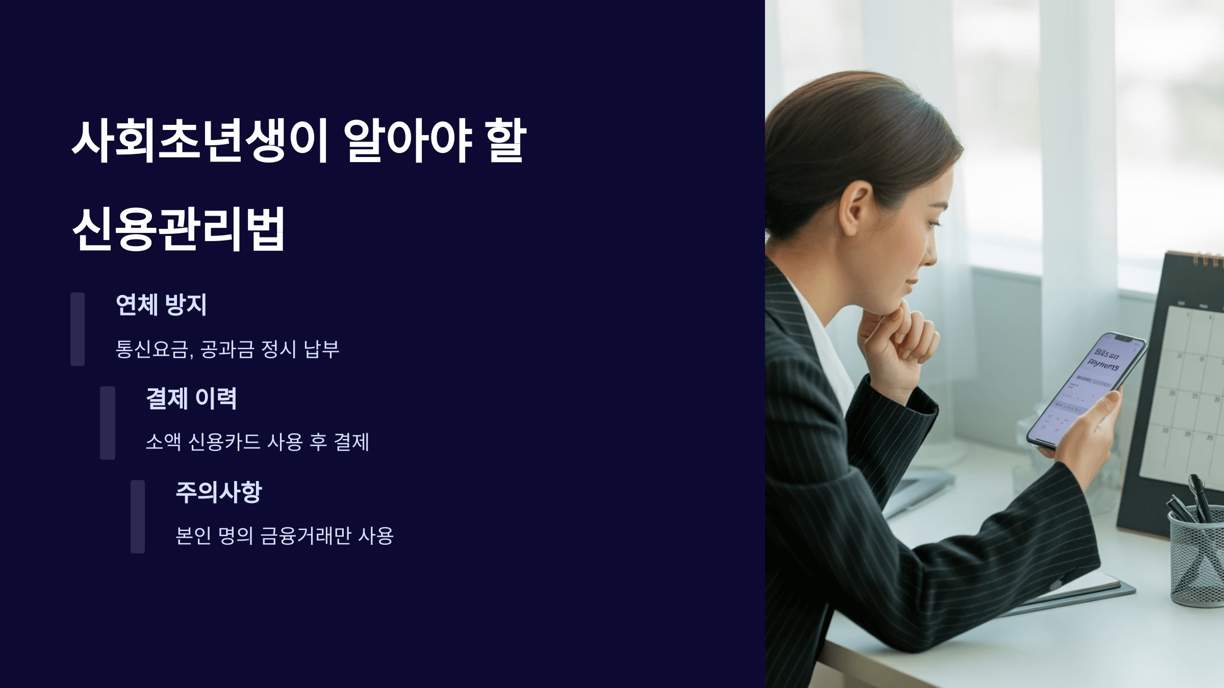 또 하나, 처음부터 신용카드를 무리해서 만들거나 사용하면 안 돼요. 사회초년생이 자주 빠지는 함정 중 하나가 ‘신용카드 한도=내 돈’이라고 착각하는 거예요. 사실 이건 빌린 돈이고, 갚지 않으면 연체 이자까지 붙어서 신용점수에 큰 타격을 줘요. 🧨