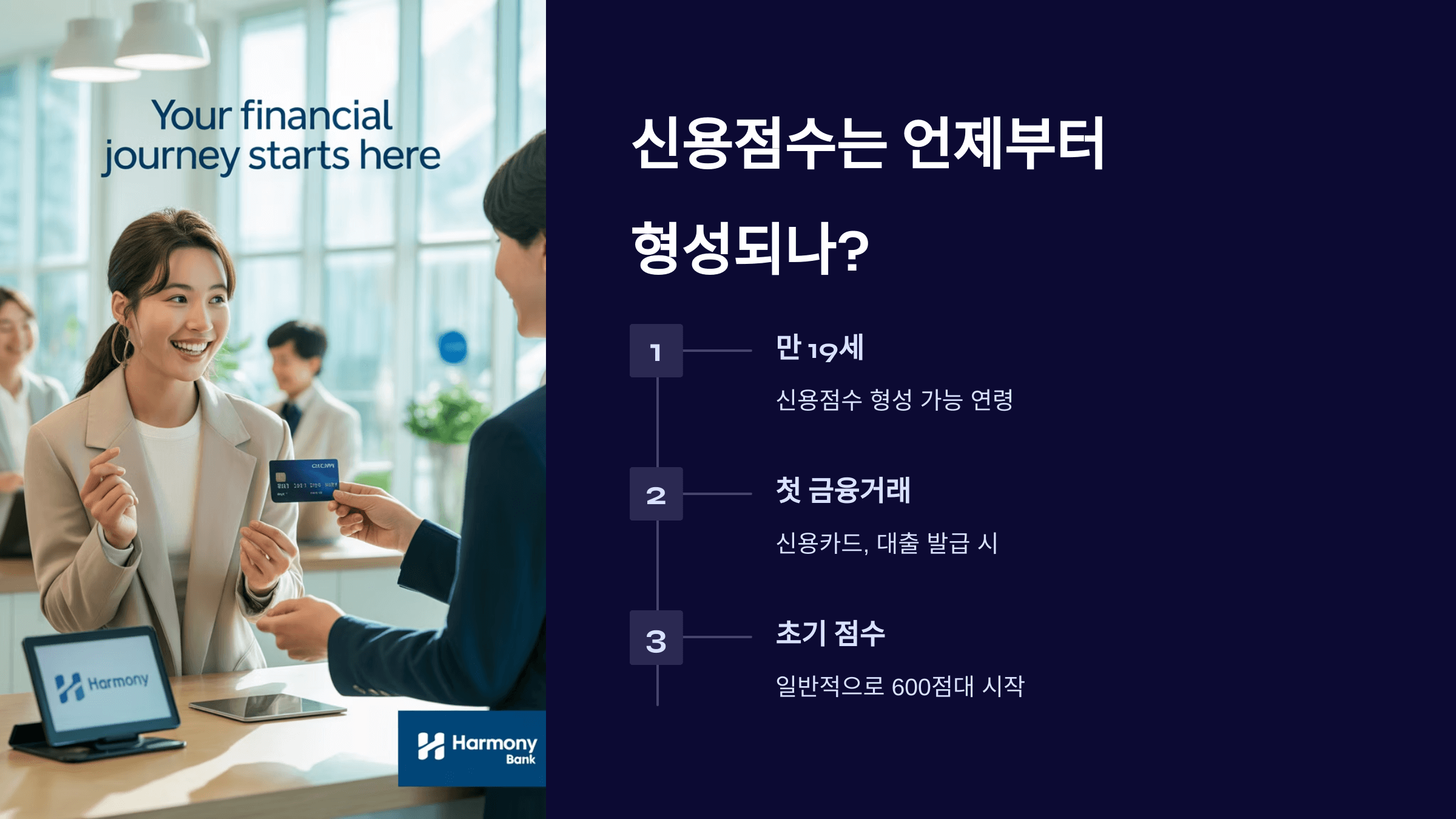 보통 주민등록증을 만들고 나서 은행 계좌를 만들거나, 체크카드를 개설하거나, 통신사에 휴대폰 요금 납부 이력이 쌓이기 시작하면 신용정보가 조금씩 쌓이기 시작해요. 이건 대부분 19~20세 무렵이에요. 하지만 진짜 점수로 환산되려면 금융기관이 보고할 수 있는 '이력'이 필요하답니다.