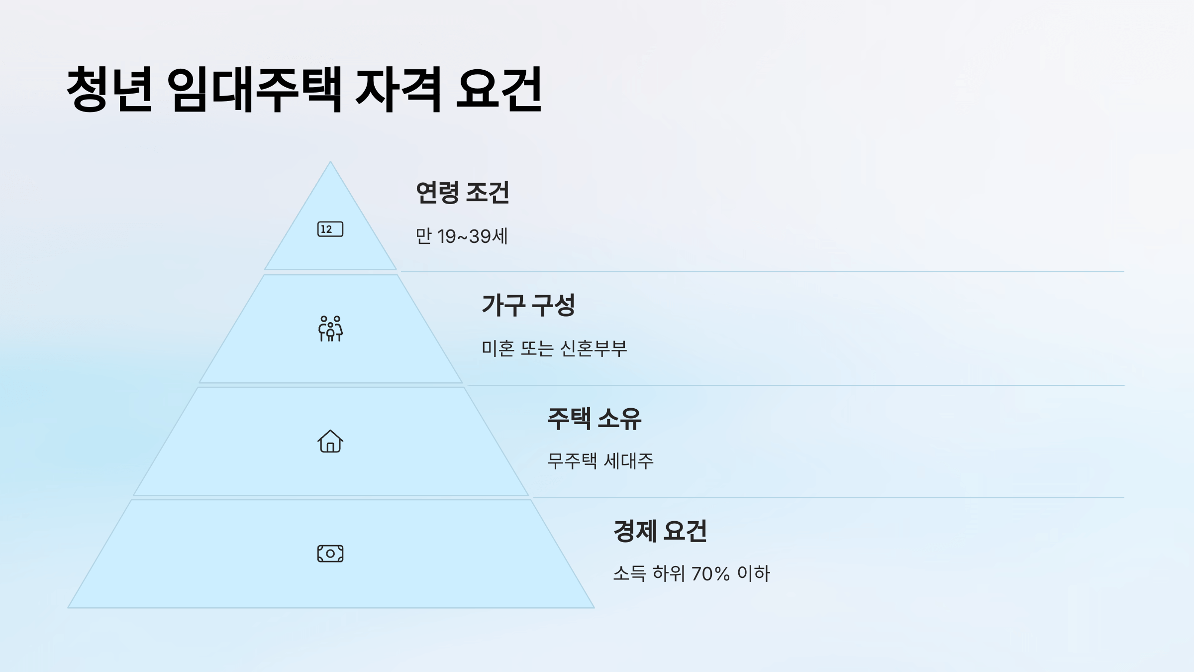 청년 임대주택을 신청하려면 기본적으로 '연령', '소득', '자산' 세 가지 조건을 충족해야 해요. 📋 일단 만 19세 이상 39세 이하 청년이어야 하고, 세대주 혹은 단독세대주 조건도 함께 갖춰야 해요.