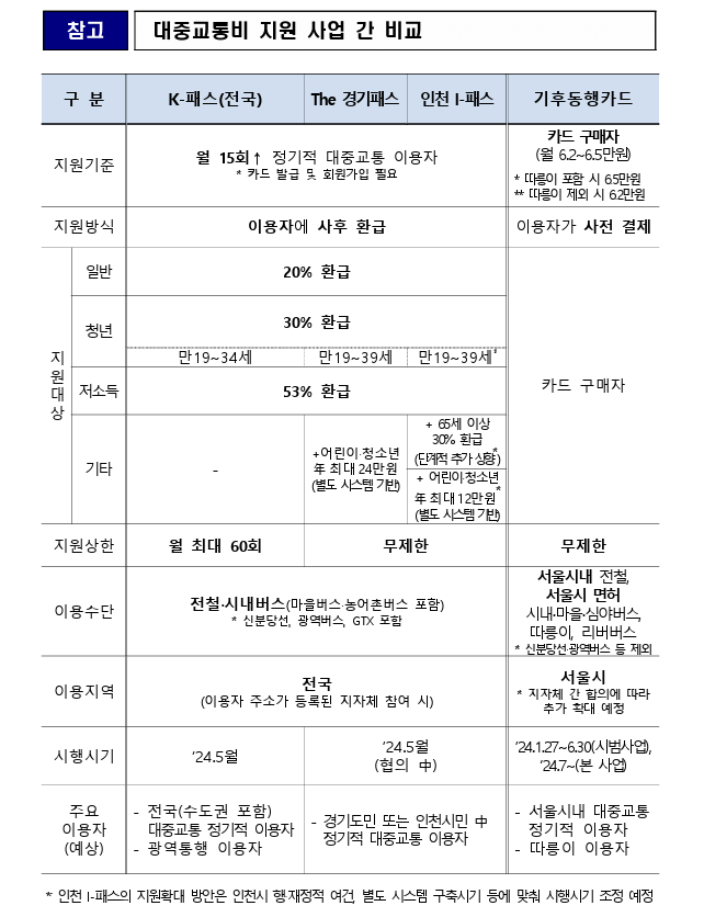 K패스, The 경기패스, 인천I-패스, 기후동행카드비교